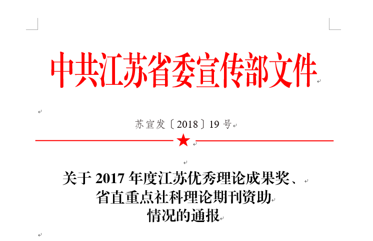 近日,江苏省委宣传部公布了2017年度江苏优秀理论成果奖及省直重点社科理论期刊资助评选结果。经组织申报、评议和审核,我院四位教师荣获2017年度江苏优秀理论成果奖。