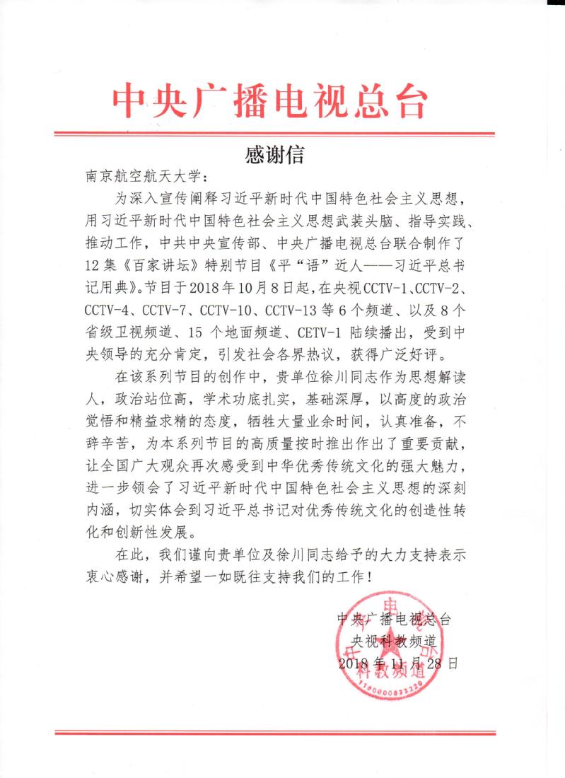 日前,中央广播电视总台发来感谢信,感谢我校对《百家讲坛》特别节目《平“语”近人——习近平总书记用典》的大力支持。