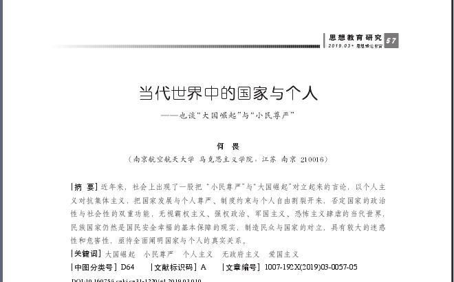 《思想理论教育》2019年第3期登载我院教授何畏《当前世界中的国家与个人——也谈“大国崛起”与“小民尊严”》。