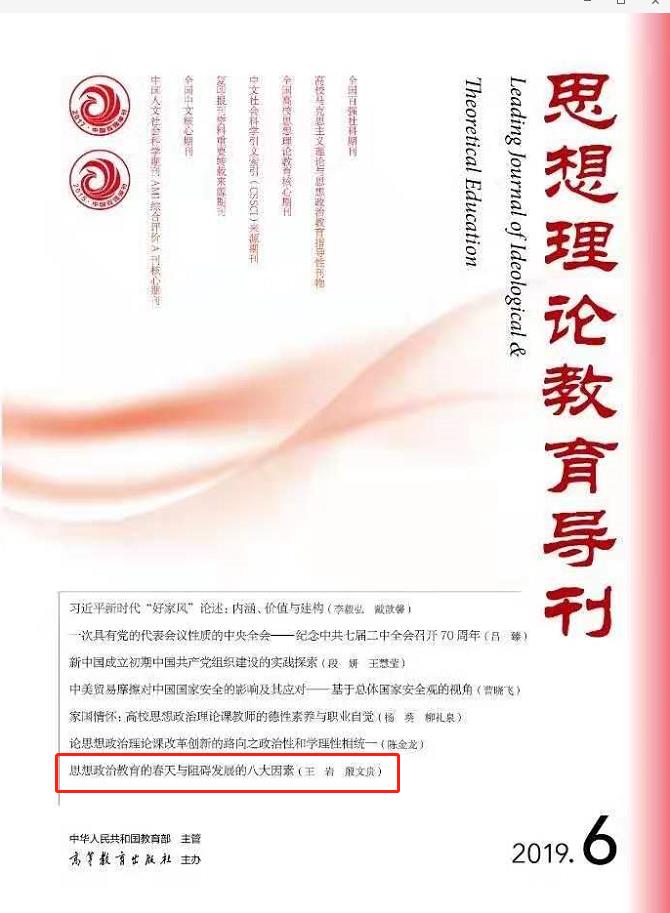 第6期《思想理论教育导刊》发表王岩教授、博士生殷文贵的文章《思想政治教育的春天与阻碍发展的八大因素》。