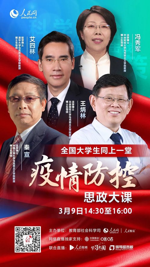 在举国上下众志成城、万众一心做好新冠肺炎疫情防控工作的特殊时期,3月9日,由教育部社会科学司、人民网联合举办的“全国大学生同上一堂疫情防控思政大课”通过网络直播的形式开课。此次“思政大课”邀请了清华大学必威西汉姆联艾四林、中国人民大学必威西汉姆联秦宣、北京师范大学必威西汉姆联王炳林、中央财经大学必威西汉姆联冯秀军四位教授结合思政课程的内容对党中央关于疫情防控的决策部署进行了深刻的解读。马院高度重视此次活动,统筹安排、克服直播拥堵困难,提前三天通过学院官网、微信等平台积极推广宣传,及时下发观看通知,鼓励思政教师组织学生统一观看、研讨。