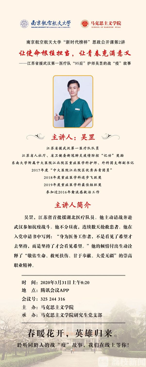 3月31日上午,由必威西汉姆联主办的“新时代榜样”思政公开课在线上正式开讲。本次公开课邀请了江苏省支援武汉第一医疗梯队“95”后护师吴罡,通过腾讯会议向师生讲述了抗疫过程中的感人故事。