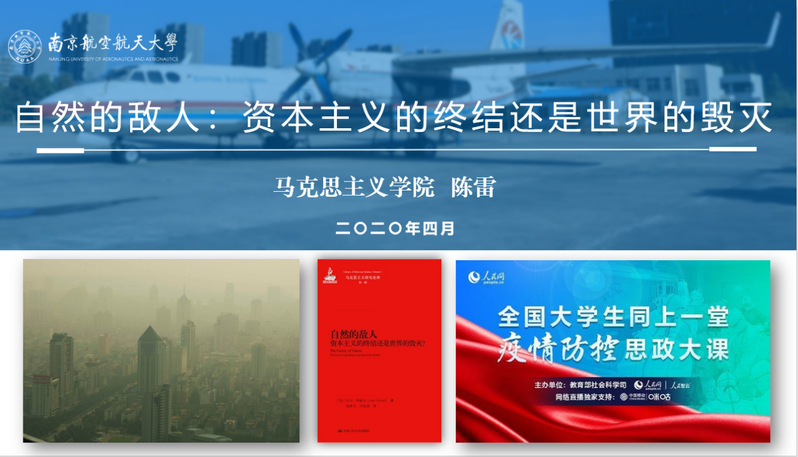 陈雷同志分享了乔尔·科威尔的《自然的敌人:资本主义的终结还是世界的毁灭?》,呼吁马院学生能通过疫情关注生态问题,研究生态危机,了解中国特色社会主义生态文明建设的先进性和优越性。