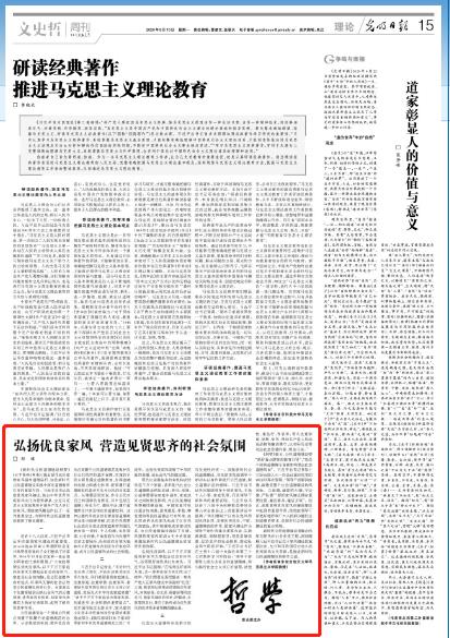 8月11日,《光明日报》第15版刊发我院博士生导师、刘琳教授的文章《弘扬优良家风 营造见贤思齐的社会氛围》,现将全文刊发如下: