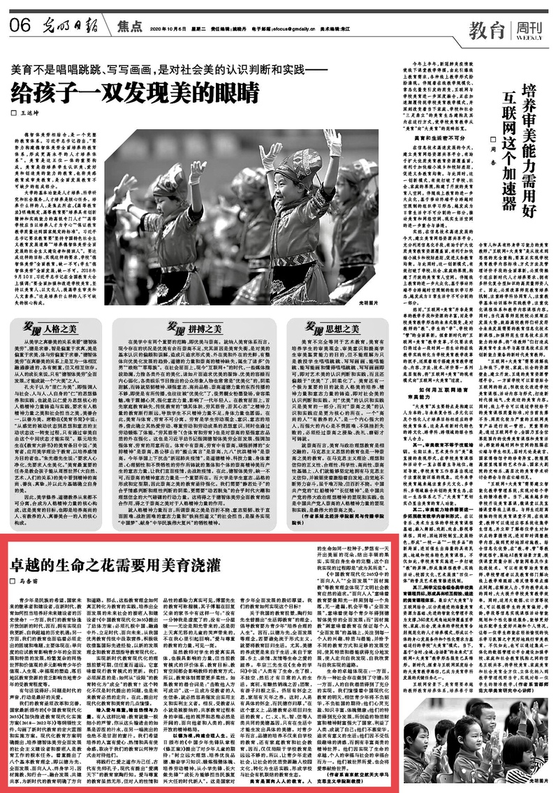 10月6日,《光明日报》第6版刊发我院硕士生导师、马杏苗副教授的文章《卓越的生命之花需要用美育浇灌》,现将全文转发如下: