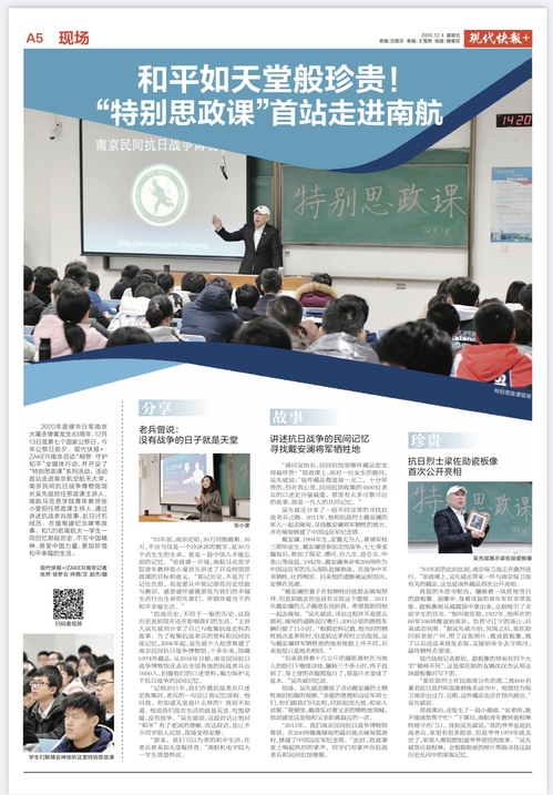 2020 年,是侵华日军南京大屠杀 83 周年,12 月 13 日,是第 7 个国家公祭日。今年公祭日前夕,现代快报 +•ZAKER 南京启动“桐祭 • 守护和平“全媒体行动,并开设了“特别思政课“系列活动。活动首站走进了必威betway西汉姆联。南京民间抗日战争博物馆馆长吴先斌担任思政课主讲人,南航马克思学院青年教师张小斐担任思政课主持人。通过讲述抗战老兵故事、赴日讨石经历、在缅甸建纪念碑等故事,和 120 名南航大一学生一同回忆那段历史,不忘中国精神,感受中国力量,更加珍惜当下的和平幸福生活。