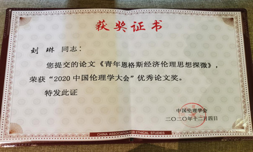 我院刘琳教授和博士生吴晨晟同学受邀参会,与诸多学者进行了丰富的学术交流与探讨。刘琳教授在大会分论坛“马克思主义伦理思想论坛”发表主题学术报告,论文《青年恩格斯经济伦理思想探微》荣获“2020中国伦理学大会”优秀论文奖。吴晨晟同学做了题为《马克思主义视阈下的私有资本下乡与乡村经济伦理》的发言。