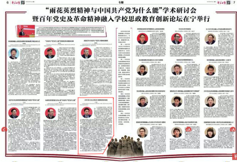 4月27日,新华日报第6-7版“‘雨花英烈精神与中国共产党为什么能’学术研讨会暨百年党史及革命精神融入学校思政教育创新论坛在宁举行”专题刊登了我院院长、博士生导师王智教授的发言《百年伟大社会革命与精神谱系构筑》,现将全文转发如下: