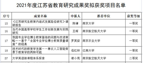 省教育厅为更好地调动全省教育系统广大教师和科研工作者开展科研创新和推动科技进步的积极性,促进产出高质量的教育研究成果,不断提升江苏教育系统科学研究的学术影响力,设立了江苏省教育科学研究成果奖,包括高校科学技术研究成果奖、高校哲学社会科学研究成果奖、教育研究成果奖三个类别,每两年评选表彰一次。今年的教育研究成果奖在单位推荐申报、形式审查和申报公示的基础上,经组织专家会议评审,共评选出获奖研究成果项目200项,其中一等奖20项、二等奖60项、三等奖120项。