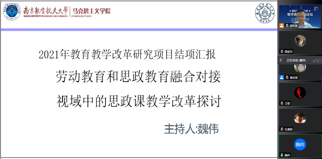 魏伟老师以“劳动教育和思政教育融合视域中的教学改革”为题,重点汇报了劳动教育和思政教育在思政课程教学中融合的三种探索模式,即思辨式教学、渗透式教学和体验式教学。