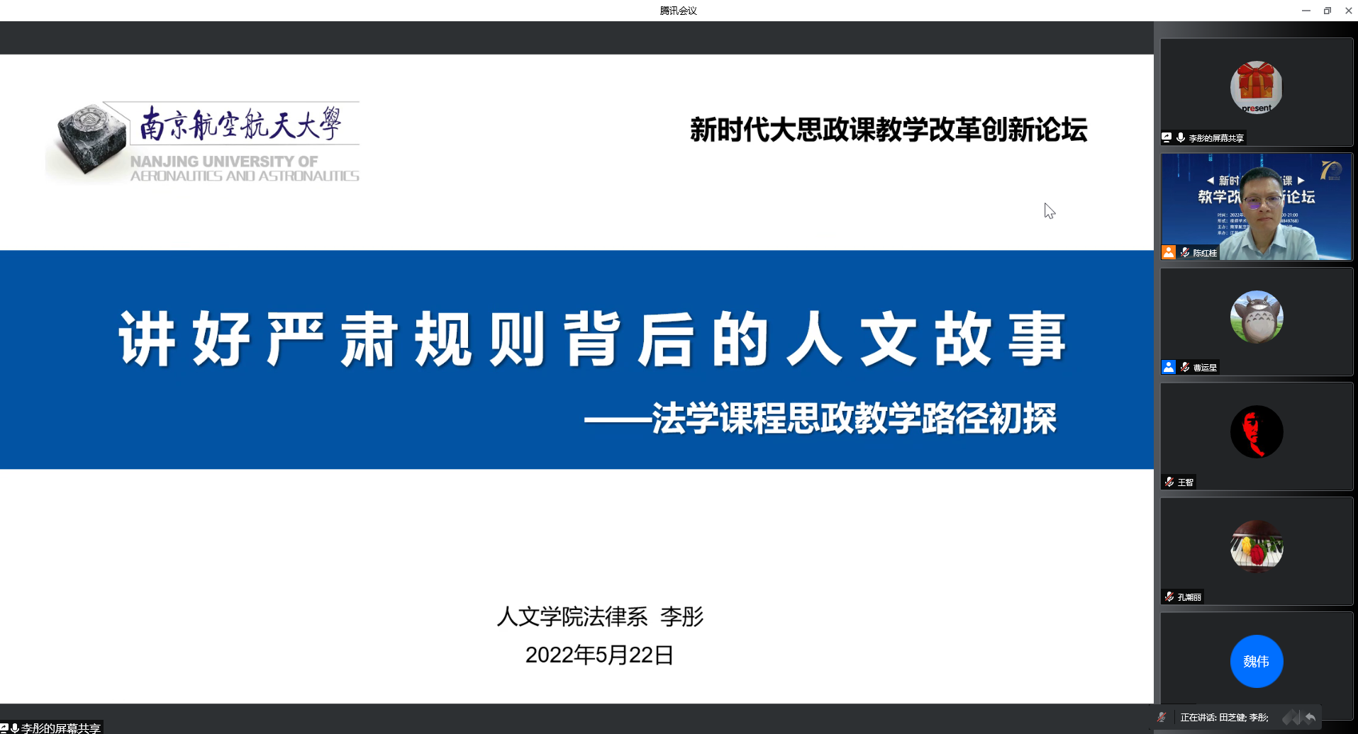 随后,田芝健教授对7位教师的交流发言做了精彩点评。他对于南航把思政课程和课程思政有机的结合起来交流,推动专业课与思政课之间的融合创新的做法深表认同。对一线教师们的教学改革特色做法以及教学改革对科研的提升印象深刻。他认为各位教师对教学问题的前瞻性思考和教学经验的归纳总结,通过交流达到了从内容到形式到方法的互相启发。这种做法延续下去将有利于持续提升教学能力和教学质量。