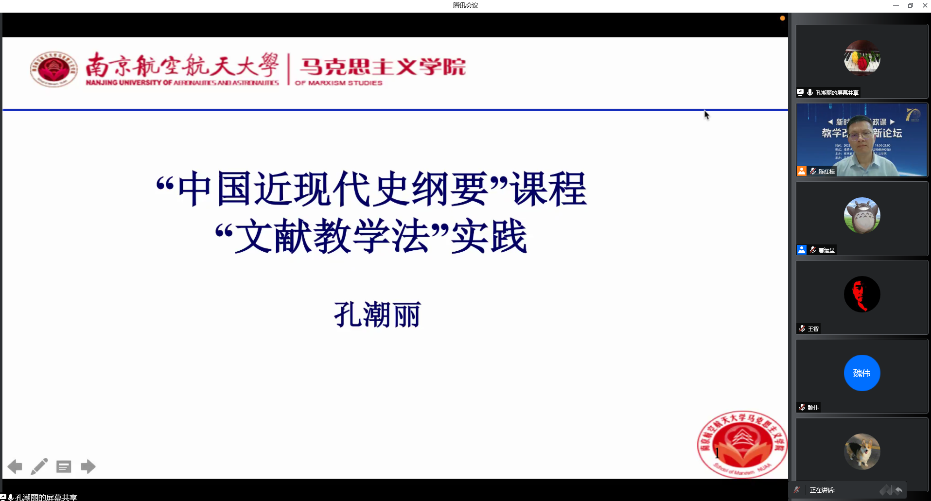 孔潮丽老师聚焦“中国近现代史纲要”课程的“文献教学法”。她从文献的类型、来源、运用以及实际教学中文献教学法优缺点着手分享了她在教学改革中的探索。认为教师可以引用文献阐述某种观点,加深学生对教材内容的理解,讲解教材的重点和难点,对教材知识进行补充和拓展。“文献教学法”使课程内容丰富,逻辑严谨,也更有说服力。教师如何选择、获取文献,并将文献适当地应用于教学当中,需要思考和探索。