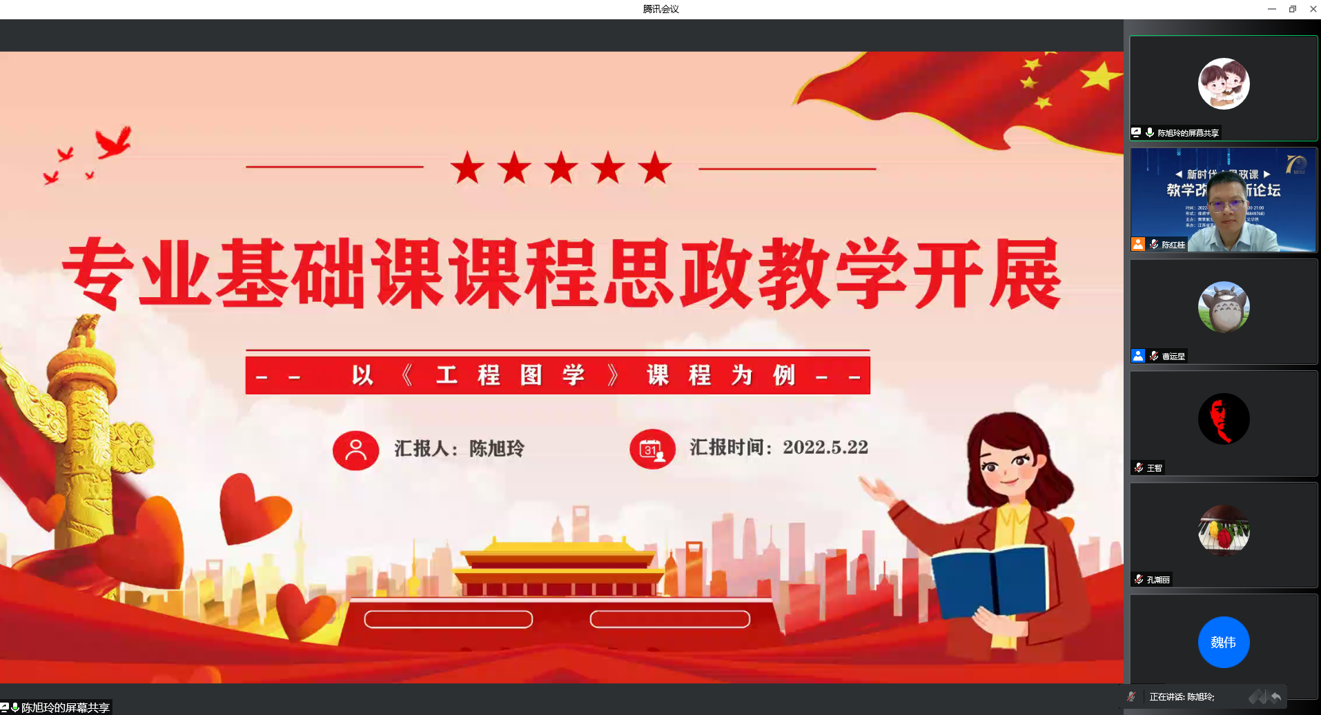 机电学院陈旭玲老师从“积极探索理论,推进课程思政”、“明确价值意蕴,挖掘思政元素”和“落实立德树人,创新教学方法”三方面介绍了《工程图学》课程开展课程思政教学的情况。力求做到创新课程思政教学方法,提升课堂的生动性和感染力,调动学生的积极性和参与感,发挥课程思政的最大效能。