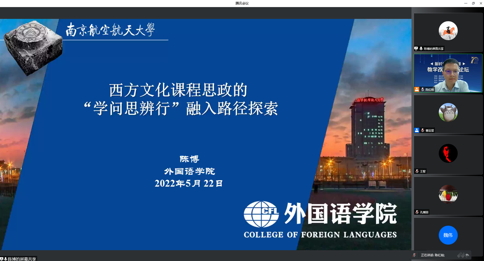 外国语学院陈博老师介绍了“当代西方文化”课程围绕课程思政融入路径展开的教改探索,提出西方文化课程思政融入路径的“学问思辨行”教学模式。该模式受习总书记引用的中国古代教学名句“博学之,审问之,慎思之,明辨之,笃行之”启发,积极探索借“审问”、“慎思”及“明辨”思辨能力培养为抓手,“博学”融入中国传统文化等思政元素的西方文化知识,“笃行”四个自信及中国立场的立德树人具体路径。
