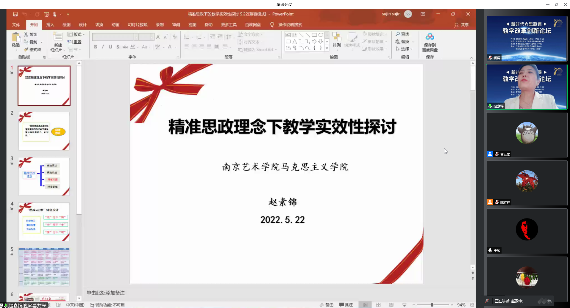 南京艺术学院必威西汉姆联赵素锦副院长就精准思政理念下提升教学实效性做了分享。她从研究精准需求、注重鲜明特色、情怀为重、方法为先、精准施策等角度阐释了对大思政课改革创新的理解。还介绍了南京艺术学院在精准思政方面的探索和经验做法。