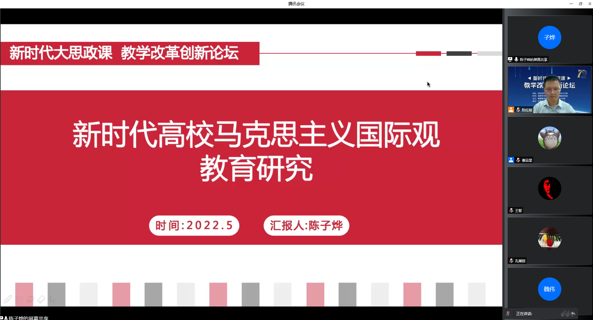 陈子烨老师分享了有关“新时代高校马克思主义国际观教育”的研究体会。她认为高质量的国际观教育对学生发展非常必要。但高校既有的国际观教育的效果仍有待优化。应该从建设课程体系、重构教学内容、探索教学方法和强化教学实践几个方面重点探索优化之路。