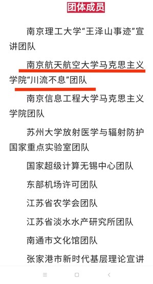 本次入选,展现出我院的理论宣讲能力与社会影响力。未来团队将注重结合学校航空、航天、民航等行业特色与优势,立足江苏大地、放眼全国,讲出自己的风格、展现出团队风采。重点宣讲习近平总书记关于弘扬科学家精神的系列重要讲话,中共中央办公厅、国务院办公厅关于《关于进一步弘扬科学家精神加强作风和学风建设的意见》的精神解读,中国共产党领导百年伟大社会革命进程中的科技发展与科学家精神锻造,“红色基因、蓝色梦想”与科学家精神的新时代弘扬路径等。