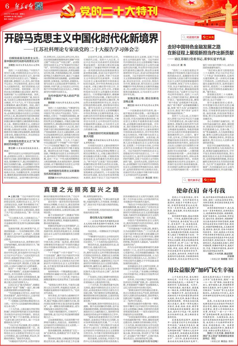 10月19日,《新华日报》第6版“党的二十大特刊”刊发了我院王智教授的特约采访《开辟马克思主义中国化时代化新境界——江苏社科理论专家谈党的二十大报告学习体会②》,现将全文转发如下: