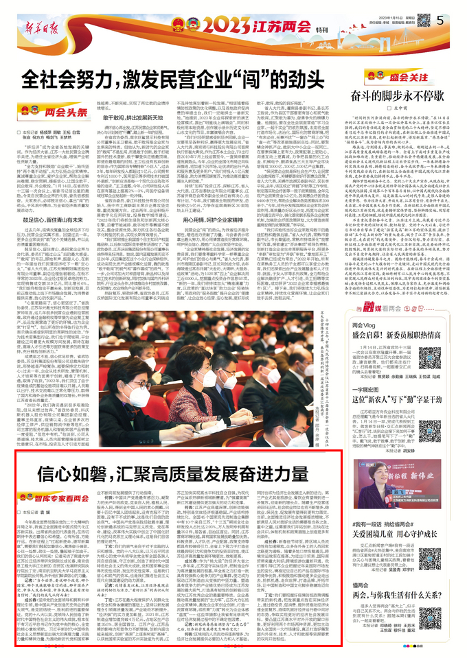1月15日,《新华日报》第5版“2023江苏两会特刊”刊发了我院何畏教授的特约采访《信心如磐,汇聚高质量发展奋进力量 》,现将全文转发如下: