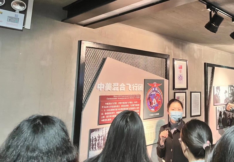 进入纪念馆内,大家依次参观了“奋勇抗敌”、“国际援华”、“壮志凌云”和“缅怀先烈”四个展区。一张张触景生情的照片,一份份弥足珍贵的遗物,一段段详实的讲解,仿佛将我们带回那段艰辛的抗战岁月:英勇无畏的革命先烈,陈旧落后的飞机模型,世界正义人士和援华人员的支持和帮助,一串串冰冷的牺牲人员名单,无一不让我们感叹那时抗战之艰难!