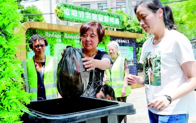 上海市社区垃圾分类指导员协助居民进行垃圾分类。新华社发