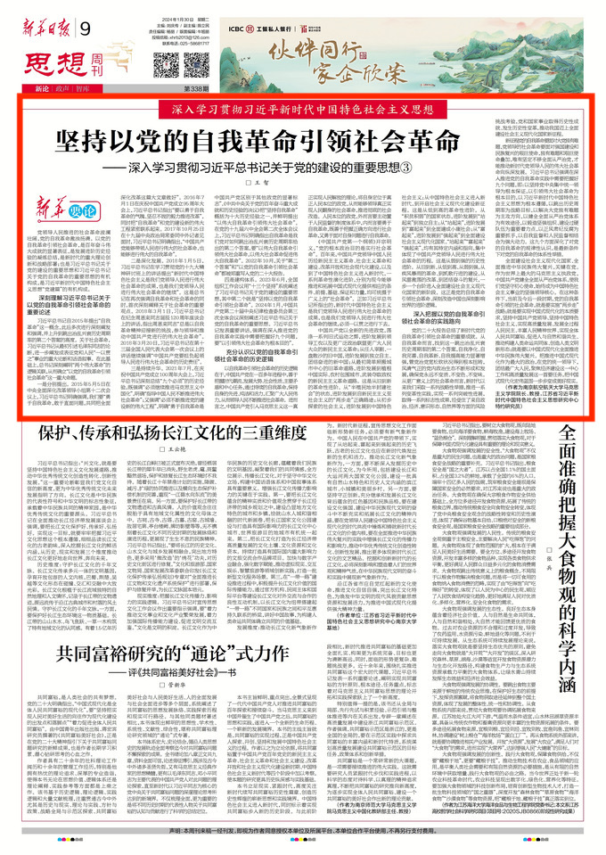 1月30日,《新华日报》第九版思想周刊栏目刊发了我院王智教授的理论文章《坚持以党的自我革命引领社会革命——深入学习贯彻习近平总书记关于党的建设的重要思想③》,现将全文转发如下:
