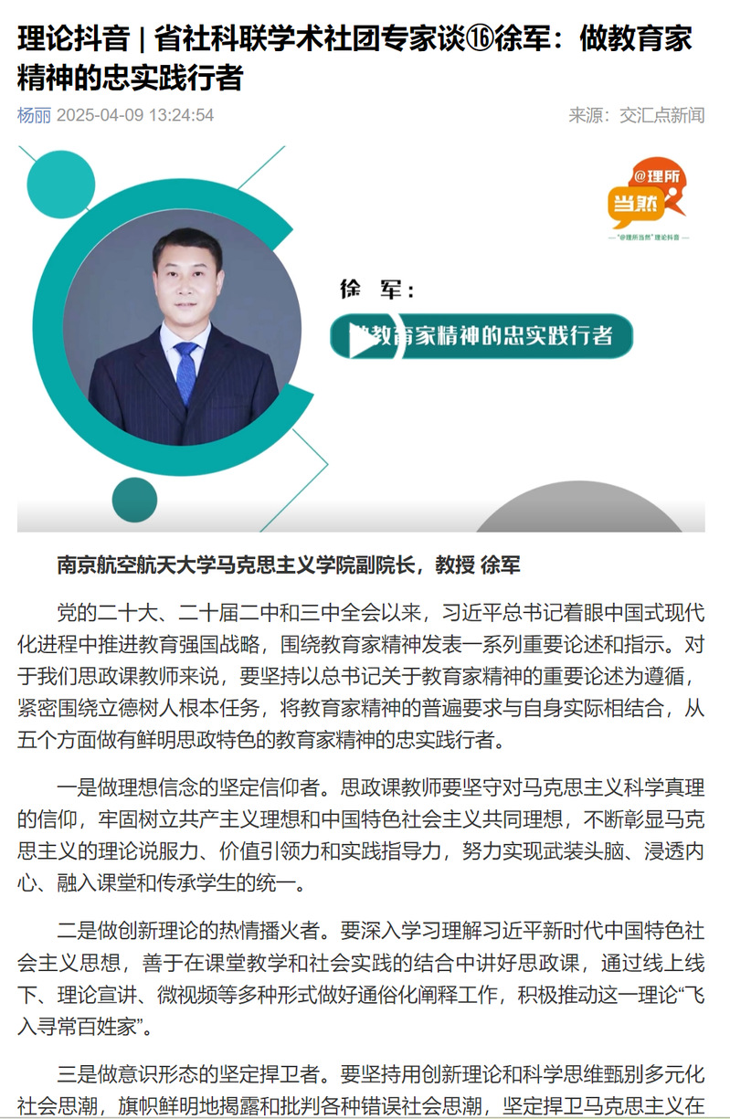 2025年4月9日,交汇点新闻刊发专题报道《省社科联学术社团专家谈⑯|徐军:做教育家精神的忠实践行者》,聚焦必威西汉姆联副院长、教授徐军关于思政课教师践行教育家精神的深度思考。文章紧扣党的二十大、二十届二中及三中全会精神,围绕习近平总书记关于教育强国战略与教育家精神的重要论述,系统阐释了新时代思政课教师如何将教育家精神的普遍要求与思政育人实践深度融合,从“坚定信仰、理论播火、捍卫意识形态、铸魂育人、引领风尚”五个维度,为打造具有鲜明思政特色的教育家精神实践路径提供了行动指南。现将核心观点梳理如下: